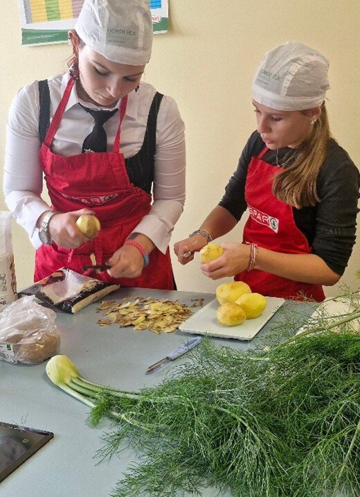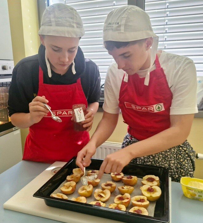 Na prvi letošnji kulinarični delavnici so sodelovali učenci 9. razredov, ki obiskujejo obvezni izbirni predmet Sodobna priprava hrane. Uporabili so sezonsko sestavino kostanj ter koromač iz šolskega vrta. Pripravili so okusna pečena jabolka, polnjena s kostanjevo kremo, ter gratiniran koromač s krompirjem. Jedi so navdušile s svojo preprostostjo, sezonskostjo in bogatim okusom.