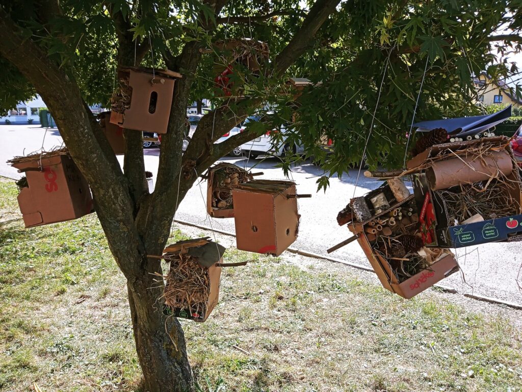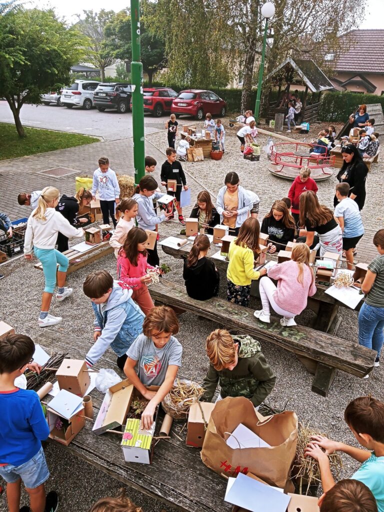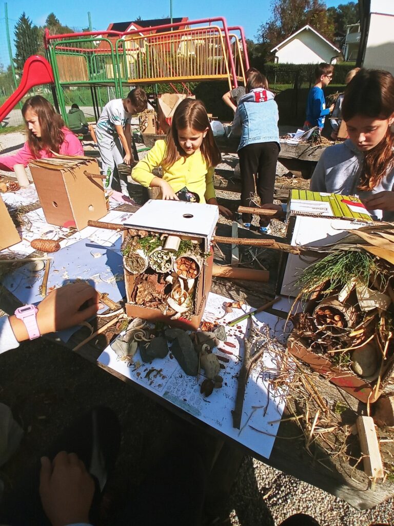 Na ta dan smo se že dalj časa pripravljali in učence spodbujali, da v okolici doma zbirajo material, ki ga bomo potrebovali za delo. Prav tako smo v času razširjenega programa z učenci odšli v gozd, kjer smo skupaj nabirali naravni material. Z učiteljico Eriko sva pripravili za vsakega učenca osnovo za ta hotel iz trdega kartona, vanj pa so potem učenci zlagali naravni material po svoji zamisli. Prav tako so učenci v času razširjenega programa oblali les – pripravili oblance in vrtali luknje v les, kamor se bodo lahko skrile žuželke.