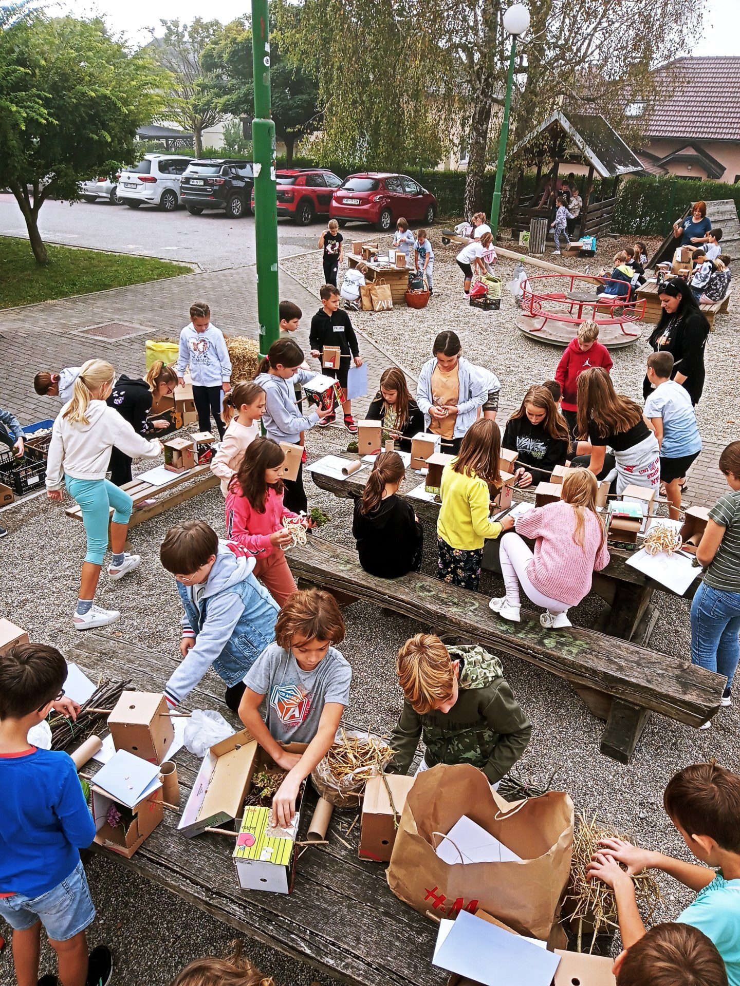 Po vseh predpripravah smo se zbrali na igrišču pred šolo, kjer je bilo že vse pripravljeno ( mize, material, lepilo….) in veliko spretnih prstkov, ki so komaj čakali, da se akcija začne. Kaj je nastalo si lahko pogledate na priloženih fotografijah. Jaz mislim, da so se zelo potrudili, kaj pa porečete vi???