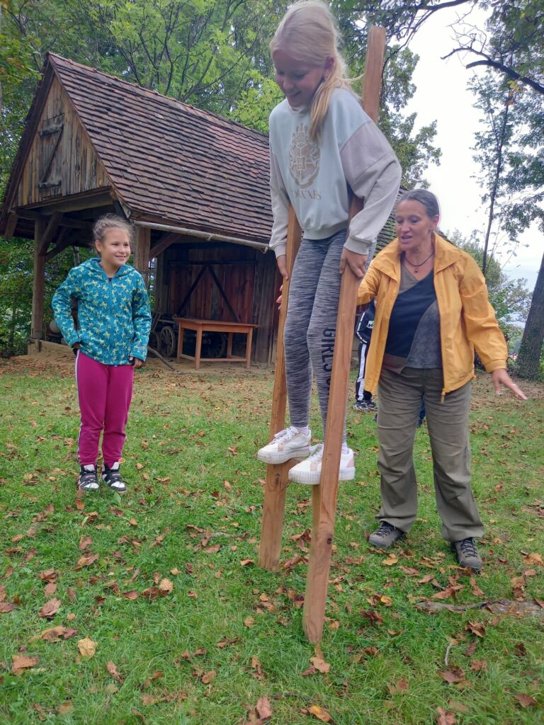 Po prisrčnem pozdravu ga. Mare Radmilovič in kratkem opisu, kaj prikazuje in kako je nastal muzej, smo se sprehodili po hiši. Učenci so si radovedno ogledovali predmete in spraševali o uporabi le teh. Še doma so pripovedovali, kako tesno jim je bilo včasih, ko so morali po trije otroci ležati na majhni postelji, saj jih je ga. Mara nagovorila, da to sami preizkusijo. Tudi hoja s hoduljami je bila nepozabna, nekateri so bili prav spretni.