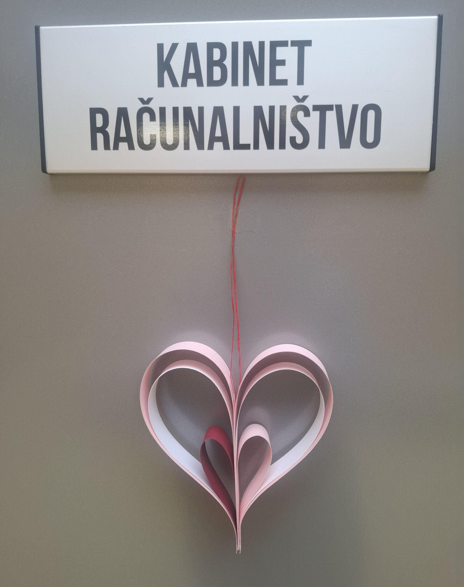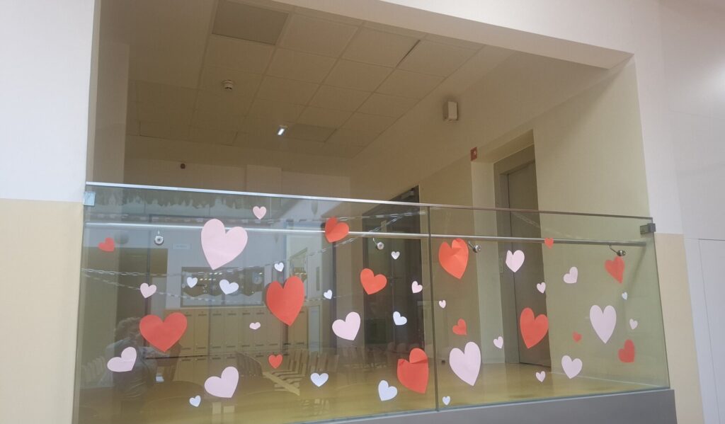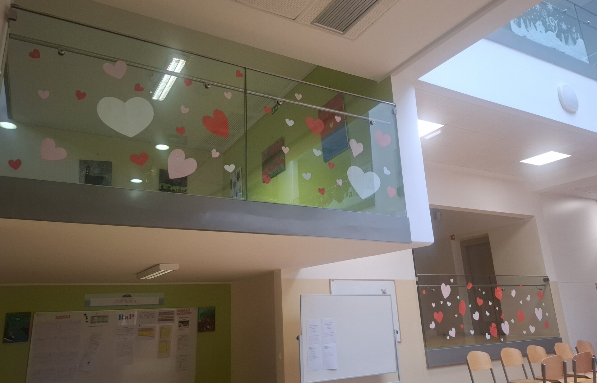 Učenci šolske skupnosti so z veliko mero stvarjalnosti okrasili hodnike in jedilnico s pisanimi srčki. Rdeča, rožnata in bela barva so zavladale šoli, srčki pa so nas opominjali, da ljubezen ni le za zaljubljene, ampak tudi za prijatelje, sošolce in učitelje.
