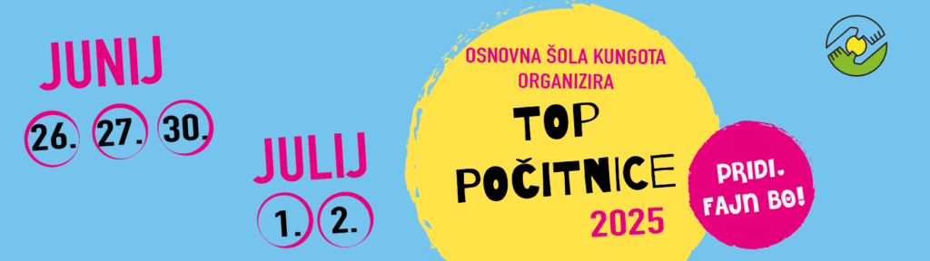 Od 26. , 27.  in 30. junija in 1. ter 2. julija 2025 organiziramo TOP POČITNICE za vašega osnovnošolca. Tudi letos smo pripravili pester program in veliko raznolikih aktivnosti. Verjamemo, da se bodo učenci zabavali in ustvarili nove nepozabne spomine.